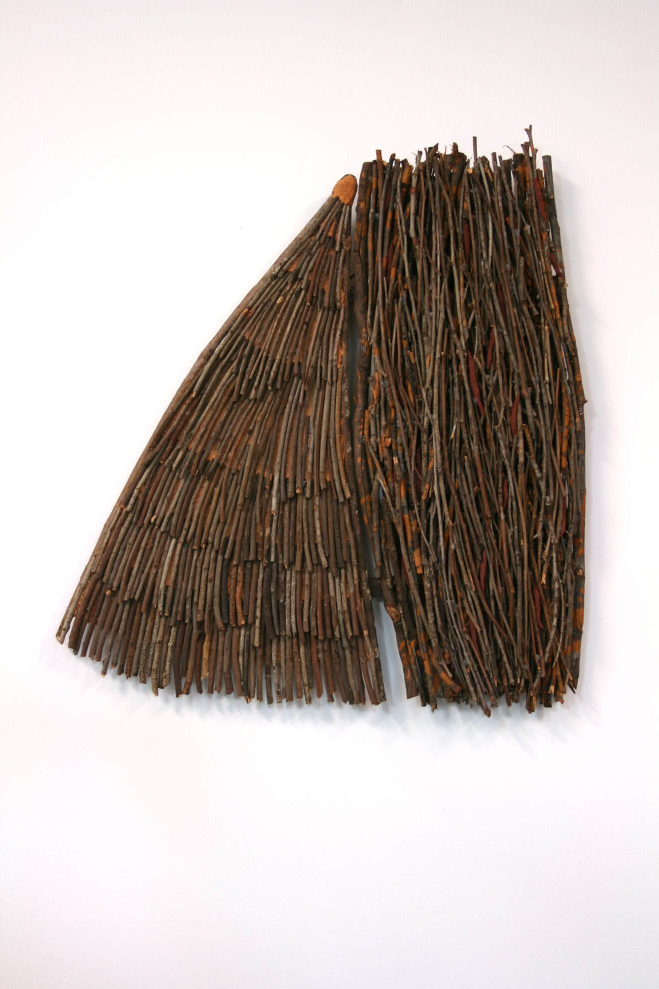 Two beautifully crafted artworks in the QUT Art Collection have intrigued me for over a decade now. I first came across them in 2010 and they could have been easily overlooked if time wasn’t taken to understand their form and construction. Composed from delicate eucalyptus twigs and wattle, it wasn’t until I held the sculptures in my hands-felt them tactilely-that I began to fully recognise their significance. There was a clarity in their seemingly ordinary nature and materiality; they straddled life as both artworks and organic forms. Their ambiguity called for me to stop, to immerse myself in the feelings and sensations that come to the surface by simply looking and touching them.
